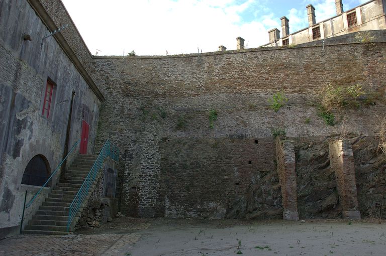 Vue de l'élévation occidentale : escalier extérieure sud donnant accès au premier étage et mur doté de contreforts donnant côté prison de PontaniouImmatriculation