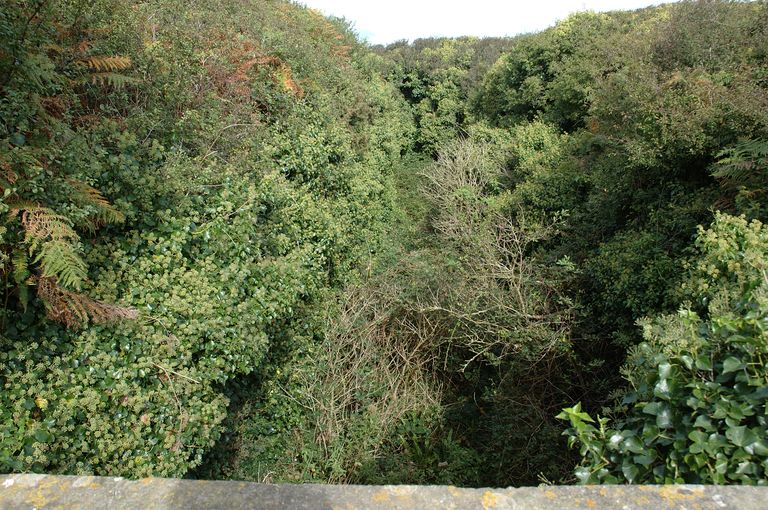 Vue du fossé sec à l'est (état en 2007). Il est envahi par la végétationImmatriculation