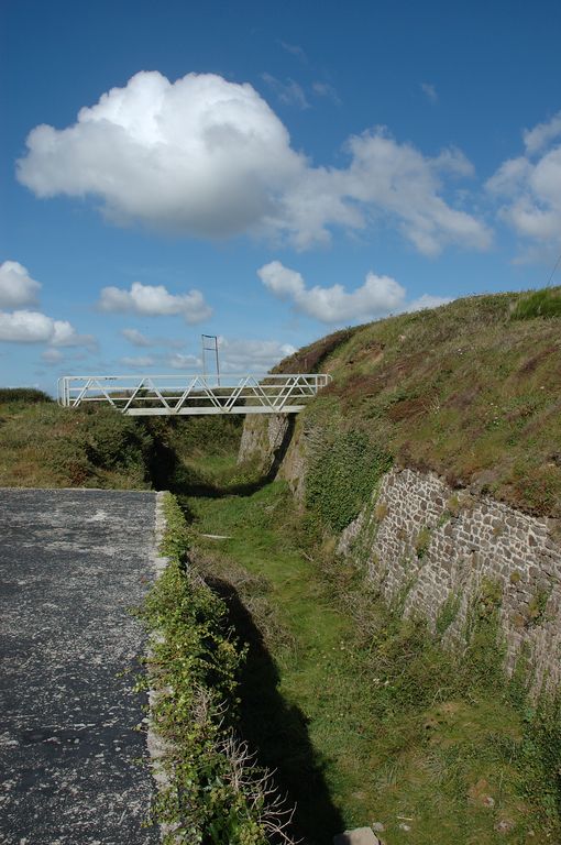 Vue du fossé sec au sud-ouest (état en 2007). A gauche, la dalle de couverture du poste de commandement de groupe de Toulbroc'hImmatriculation