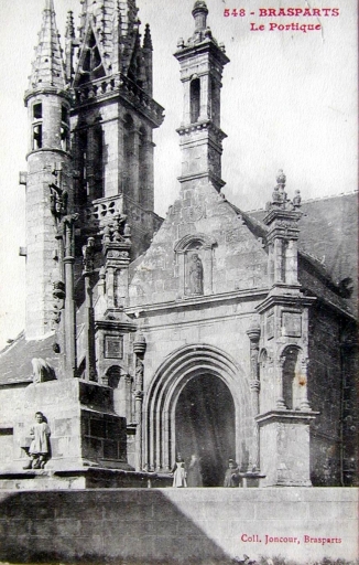 Le calvaire, le porche et le massif occidental. Carte postale, vers 1900 (A.D. Finistère, 2 Fi 16)Immatriculation