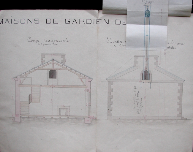 Elévation et coupe transversale de la maison-phare, 1857 : remarquer la potence (AD 22)Immatriculation