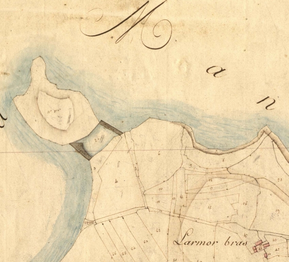 Extrait du cadastre de 1819 : remarquer les 2 digues au niveau du double tombolo de Menez Balanec (AD 22)Immatriculation