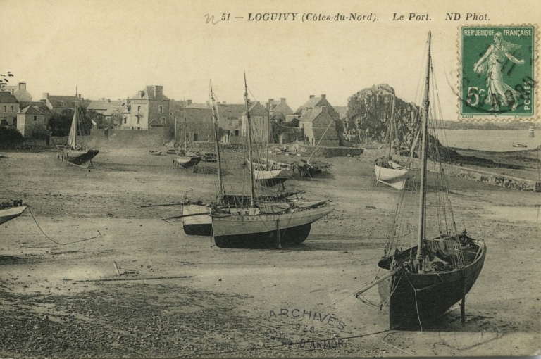 Le port de Loguivy de la mer vers 1910 : remarquer la cale ouest, les murs de soutènement et les langoustiers à viviers (AD 22 16 Fi)Immatriculation