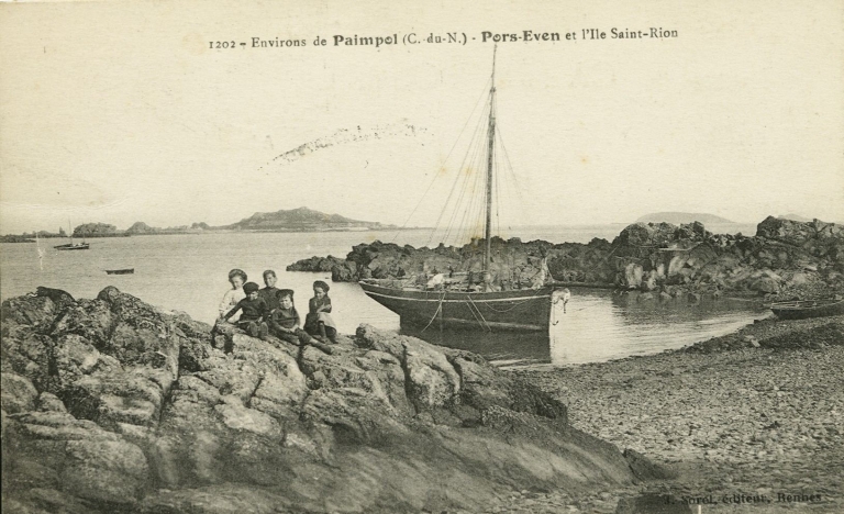 Vue du front de mer de Pors Even, devant l'Île Saint-Riom, 1er quart 20ème siècle : un sloop homardier échoué dans une petite anse (AD 22, 16 Fi)Immatriculation