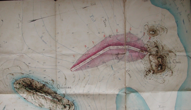 Plan daté de 1886 : projet de construction d'un barrage en enrochements dans la passe de Roc'h Cren (AD 22)Immatriculation