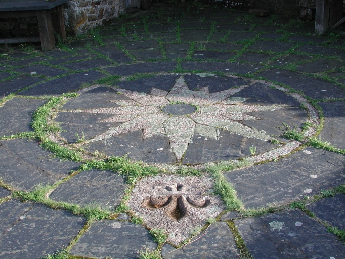 Vue du dessin de la rose des vents et de la fleur de lys en granite et en schiste, situées sur la terrasse qui borde l'ancien corps de gardeImmatriculation