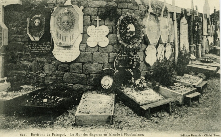 Le 'Mur des Disparus', 1er quart 20e siècle : remarquer les nombreuses couronnes et les plaques en marbre en souvenir des 'disparus' en mer (carte postale, AD 22)Immatriculation