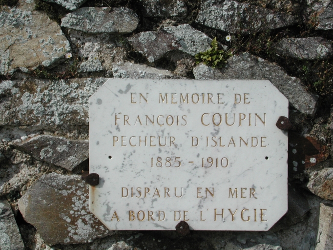 Vue d'un 'Mémoire', en souvenir d'un péri en mer en 1910, à bord de la goélette 'Hygie'Immatriculation