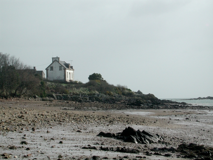 Vue de la maison-phare devant la grève de la baie de Paimpol à marée basseImmatriculation
