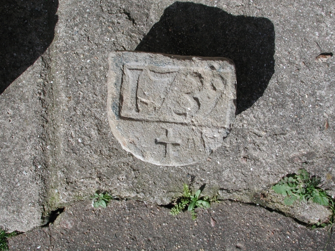 Vue de détail de l'écusson à gauche du portail, portant la date de 1739 avec une croixImmatriculation