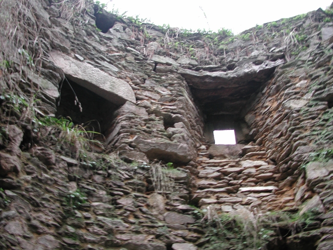 Vue des ouvertures supérieures sous le couronnement supportant la charpente détruiteImmatriculation