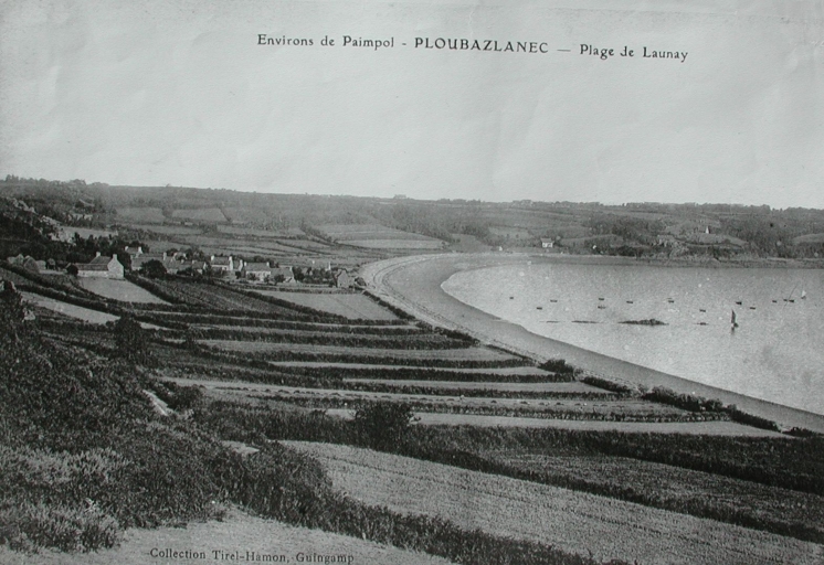 Vue du littoral de Launay au début du 20ème siècle : remarquer la forme des parcelles en lanières, en bord de mer (carte postale, collection particulière)Immatriculation