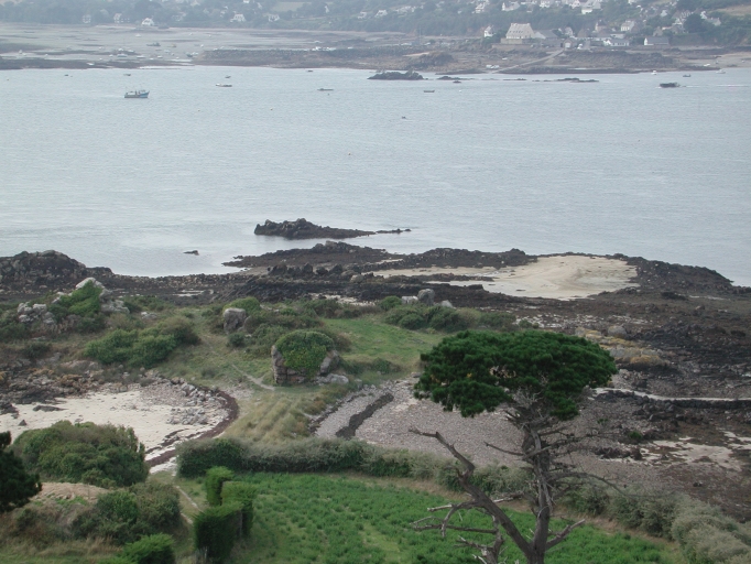 Vue de la pointe Sud-Ouest de l'île Saint-Riom : la pointe aux Courlis devant Pors Even, les pêcheries sur l'estranImmatriculation