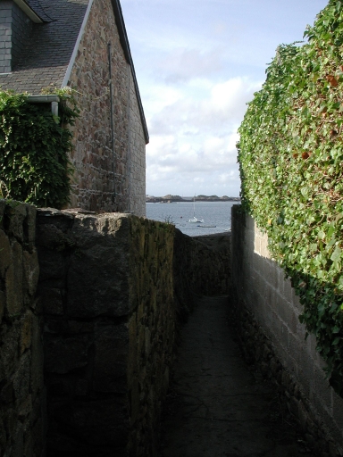 Vue d'une petite sente traditionnelle donnant accès à la grève dans le quartier du Porjou, entre les maisons de pêcheursImmatriculation