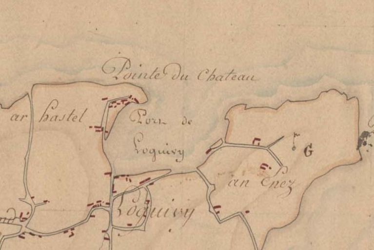 Extrait du cadastre de 1832 , section E1, tableau d'assemblage : le front de port de Loguivy-de-la-Mer : remarquer la présence du bâti dans la partie Ouest du port, le Porjou (AD 22)Immatriculation
