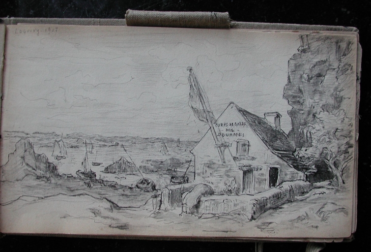 Extrait carnet de dessins : le corps de garde de Loguivy par Auguste Boulard (fils), 1907 (collection particulière)Immatriculation