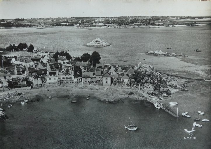 Vue aérienne du port de Loguivy vers 1960 : remarquer la cabane en bois de la Douane, sous le Rocher du Château (carte postale, collection particulière)Immatriculation