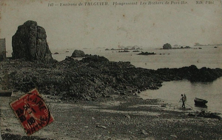 Vue de Pors Hir, début 20e siècle : deux petites cales enrochées permettaient le débarquement, début 20e siècle (carte postale collection particulière)Immatriculation