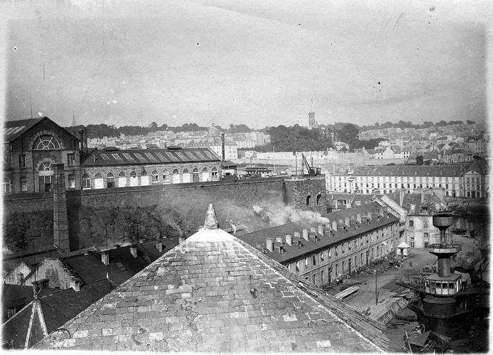 Vue de l'arsenal de Brest vers 1900 : formes de construction, bassins de radoub de Pontaniou dits formes de Pontaniou. A gauche : les ateliers du plateau des CapucinsImmatriculation