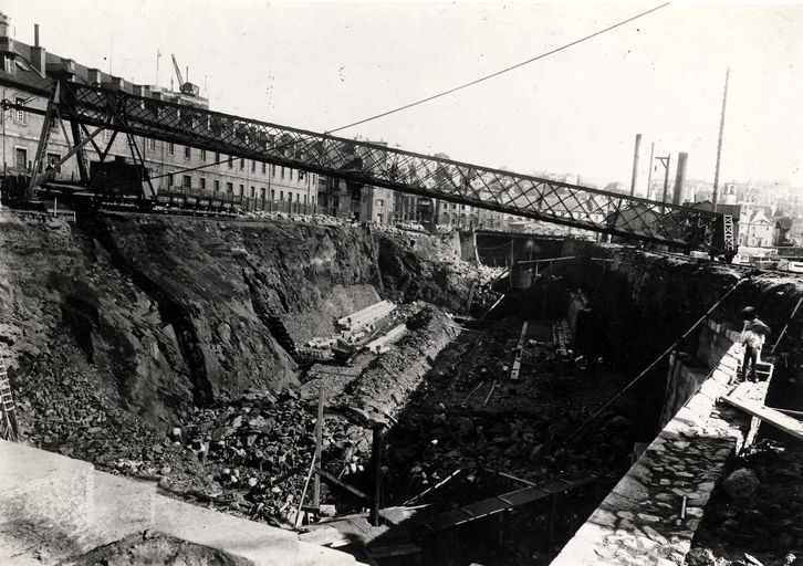 Vue de l'arsenal de Brest entre 1899 à 1902 : travaux d'agrandissement des formes de construction, bassins de radoub de Pontaniou dits formes de Pontaniou. Passage de quatre petites formes à deux grandesImmatriculation