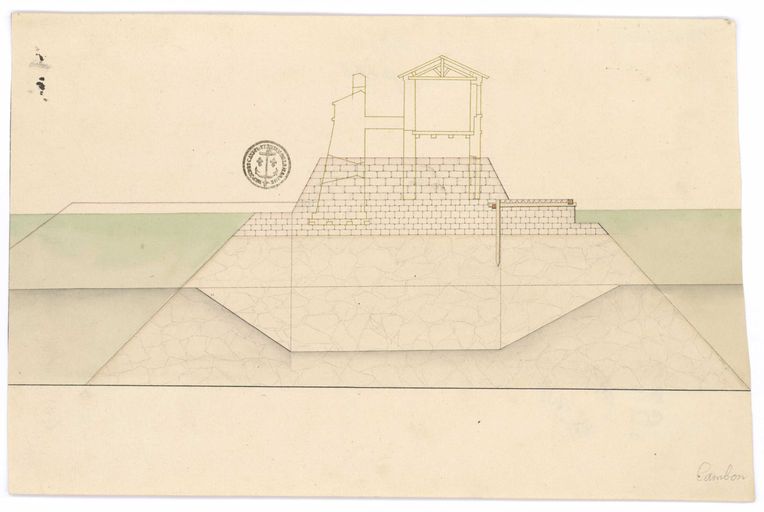 Coupe selon l'axe nord-sud du fort proposé sur le rocher du Mengant au milieu du Goulet de la rade de Brest, 1683, projet supervisé par VaubanImmatriculation