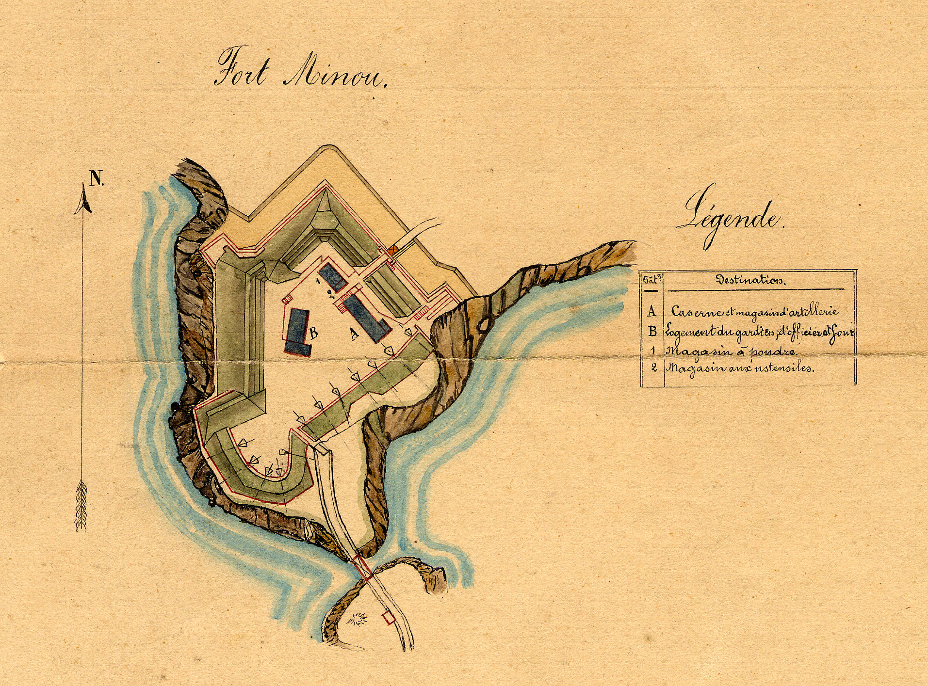 Plan du fort du Minou, 3e quart 19e siècle. La batterie d'artillerie comporte douze bouches à feu avec accès au phare. Dans la cour : caserne et magasin d'artillerie (A), logement du gardien, d'officier et four (B), magasin à poudre (1) et magasin aux ustensiles (2)Immatriculation