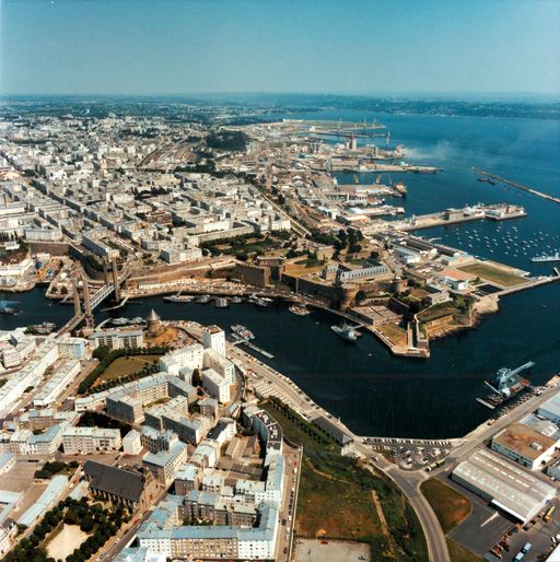 Vue aérienne oblique de Brest en 1984 : la Penfeld, l'arsenal, Recouvrance (rive droite), le pont de Recouvrance, la tour Tanguy, la ville (rive gauche), le château. En arrière-plan : le port de commerce, Poullic Al LorImmatriculation
