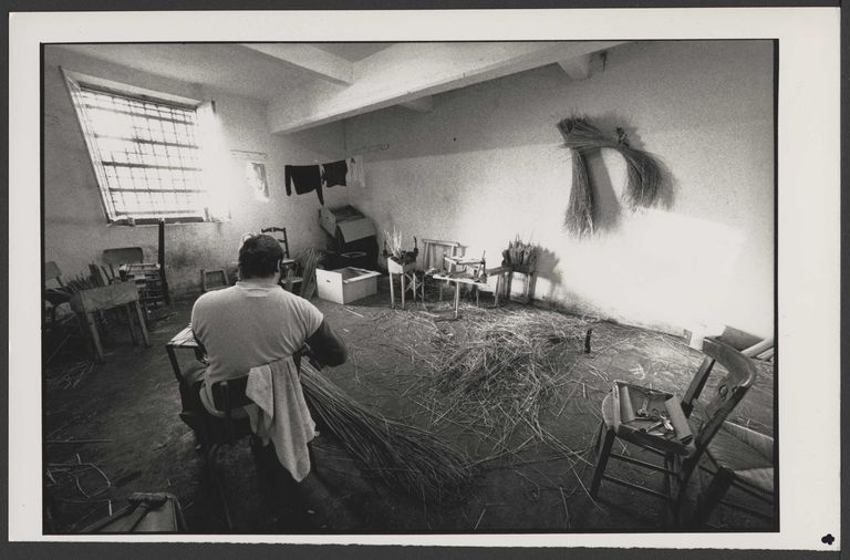 La prison de Pontaniou par Bruno Ravalard, 1989 : l'atelier vannerie au 3ème étage, un détenu photographié de dos est en train de rempailler une chaise avec de l'osierImmatriculation