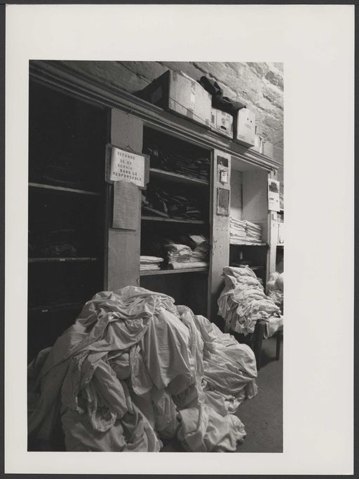 La prison de Pontaniou par Bruno Ravalard, 1989 : linge empilé dans une étagère de la buanderie. On peut lire : DEFENSE DE SE SERVIR SANS LE RESPONSABLEImmatriculation
