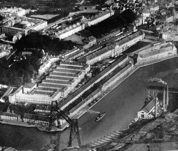 Vue aérienne oblique de Brest en 1926 : la Penfeld, l'arsenal, l'hôpital maritime, le bagne, la caserne de l'Infanterie Coloniale, les corderies haute et basse (rive gauche) et le pont transbordeur en ferImmatriculation