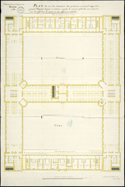 Projet d'hôpital militaire à Brest, projet de 1781, fait à Brest le 4 juillet 1781 par Dumoulin : plan d'un grand hôpital Royal et militaire capable de contenir 960 lits, plan du 2ème étageImmatriculation