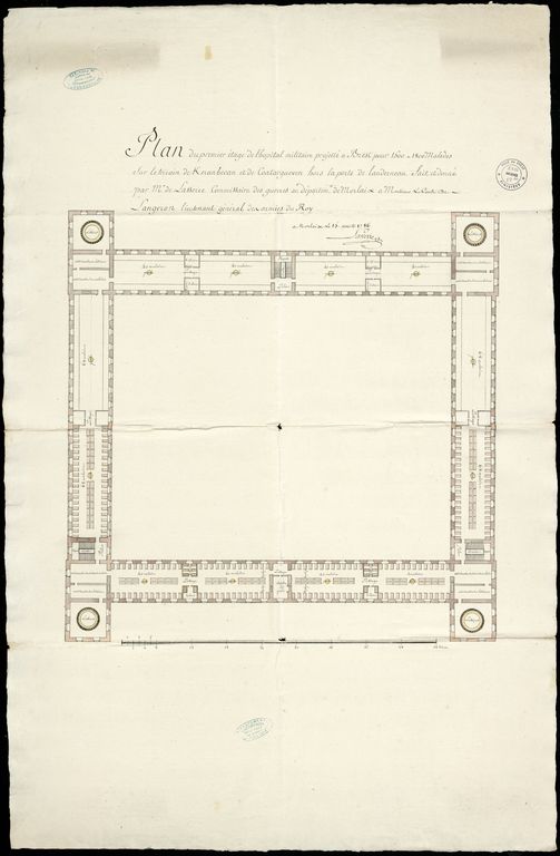 Plan du 1er étage d'un hôpital militaire pour 1500 à 1800 malades sur le terrain de Keranbecan et de Coatargueven hors de la porte de Landerneau à Brest, fait à Morlaix le 15 août 1786 par Lasserre adressé à Langeron, lieutenant généralImmatriculation