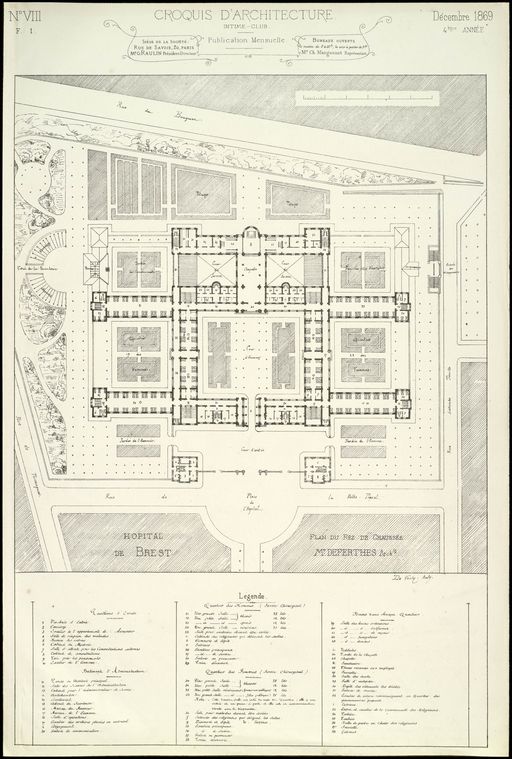 Projet d'hôpital pour Brest par Edouard Deperthes, architecte de la ville de Brest : plan général et légende, Intime-club, croquis d'architecture, publication mensuelle, décembre 1869Immatriculation