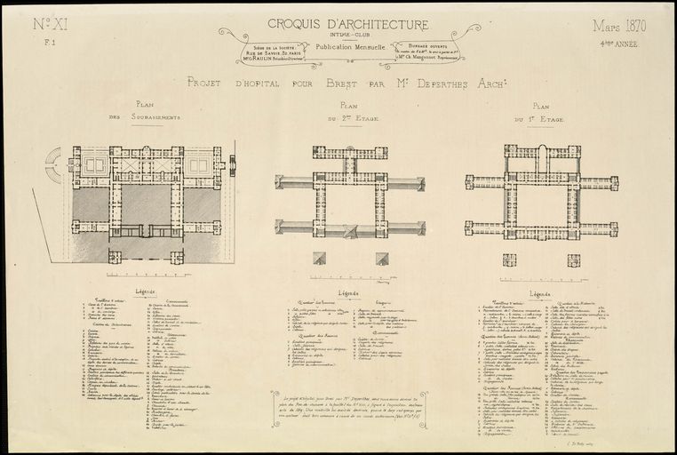 Projet d'hôpital pour Brest par Edouard Deperthes, architecte de la ville de Brest : plan général et légende, Intime-club, croquis d'architecture, publication mensuelle, mars 1870Immatriculation