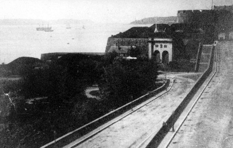 Vue des batteries du château, de la porte d'entrée monumentale du tunnel ferroviaire de l'arsenal, de l'escalier, des rampes et de la porte du Port de CommerceImmatriculation