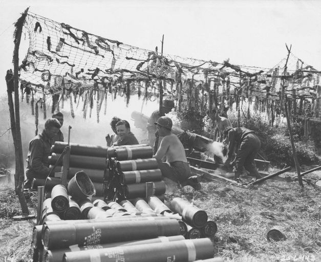 Vue d'un canon américain de campagne tirant sur Brest lors de l'assaut final, septembre 1944 (U.S. Army Signal Corps)Immatriculation