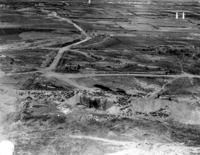 Vue aérienne oblique de la batterie lourde allemande codé M.K.B. Holtzendorf (Stp. Re 305) (4 canons de 150 mm) (1 / M.A.A. 262), septembre 1944 (U.S. Army Signal Corps)Immatriculation