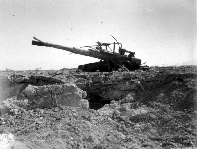 Vue de la festung Brest pendant la bataille de Brest, U.S. Army Signal Corps, septembre 1944 : canon antiaérien de 105 mm hors d'usage, aux environs de BrestImmatriculation