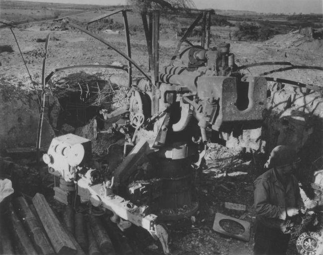 Vue de la festung Brest pendant la bataille de Brest, U.S. Army Signal Corps, septembre 1944 : canon antiaérien de 105 mm hors d'usage, aux environs de Brest (batterie antiaérienne de Kermeur)Immatriculation