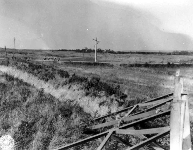 Vue de la jonction entre le fossé anti-char et la ligne continue d’obstacles constituée de barrières Cointet située au nord du fort de Keranroux et de la Butte du Polygone de la Marine (United States Army Signal Corps, septembre 1944). En arrière-plan, la route de Guilers et son barrageImmatriculation