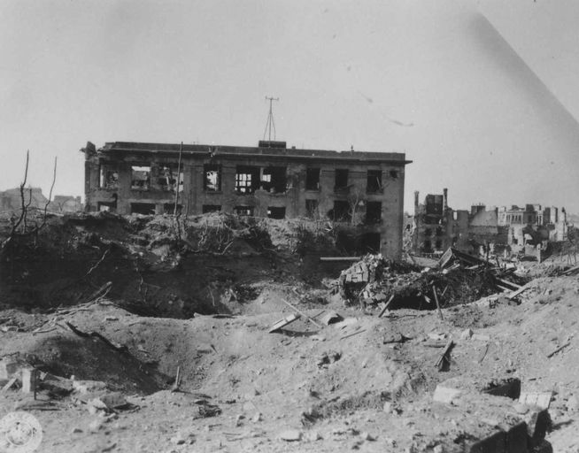 Vue de la festung Brest pendant la bataille de Brest, U.S. Army Signal Corps, septembre 1944 : fortifications d'agglomération au niveau de la Place des Portes. En arrière-paln : la PosteImmatriculation