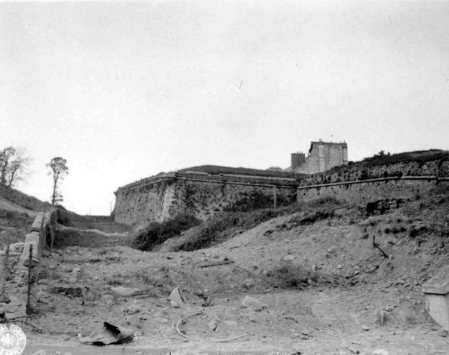 Vue de la festung Brest pendant la bataille de Brest, U.S. Army Signal Corps, septembre 1944 : fortifications d'agglomération côté Recouvrance, bastion 23, à hauteur des halles. Pignon et cheminée de la caserne KervéguenImmatriculation