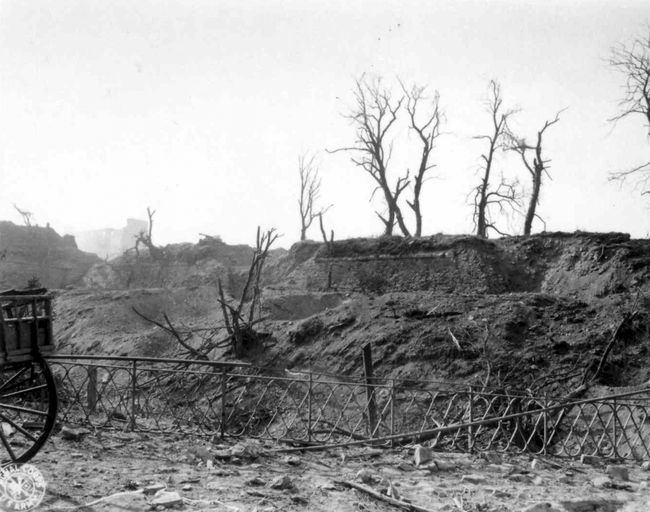 Vue de la festung Brest pendant la bataille de Brest, U.S. Army Signal Corps, septembre 1944 : fortifications d'agglomération dans le secteur de la Place des PortesImmatriculation