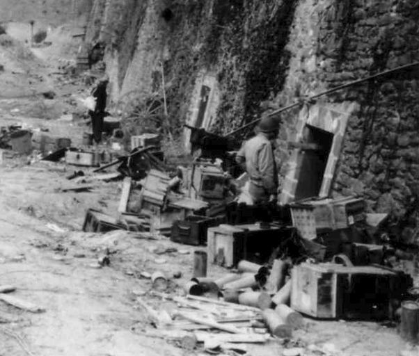 Vue de la festung Brest pendant la bataille de Brest, U.S. Army Signal Corps, septembre 1944 : arrière de la batterie de Quéliverzan (4 canons de 10,5 cm de type le.F.H. 325 (f) sous casemate de type 669) (B 18) (1/ H.A.A. 1162)Immatriculation