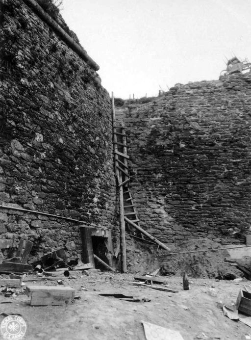 Vue de la festung Brest pendant la bataille de Brest, U.S. Army Signal Corps, septembre 1944 : arrière de la batterie de Quéliverzan (4 canons de 10,5 cm de type le.F.H. 325 (f) sous casemate de type 669) (B 18) (1/ H.A.A. 1162)Immatriculation