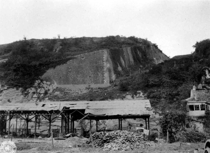 Vue de la festung Brest pendant la bataille de Brest, U.S. Army Signal Corps, septembre 1944 : fortifications d'agglomération depuis la route du Moulin à Poudre, angle du bastion de l'ouvrage du BouguenImmatriculation