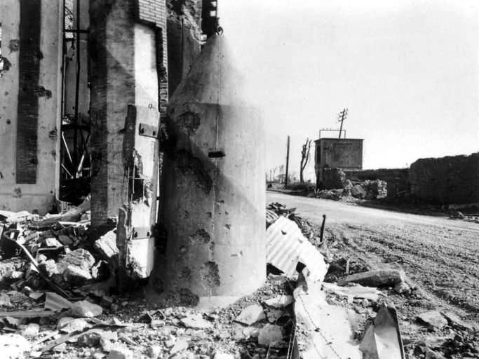 Vue de la festung Brest pendant la bataille de Brest, U.S. Army Signal Corps, septembre 1944 : guérite bétonné de factionnaire située à côté du garage automobile Citroën détruit, place de StrasbourgImmatriculation