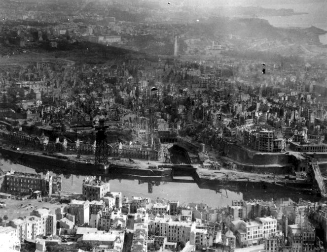 Vue de la festung Brest pendant la bataille de Brest, U.S. Army Signal Corps, septembre 1944 : vue aérienne oblique de la ville dévastéeImmatriculation