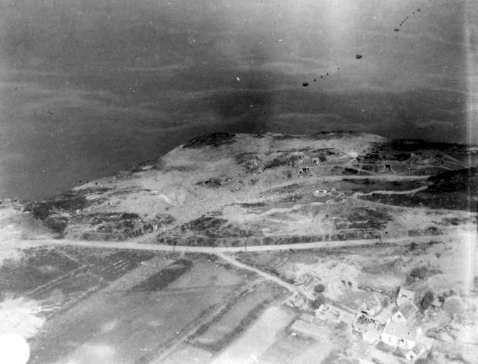 Vue de la festung Brest pendant la bataille de Brest, U.S. Army Signal Corps, septembre 1944 : vue aérienne oblique de la batterie haute de la Pointe Robert à RoscanvelImmatriculation