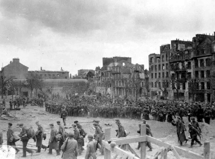 Vue de la festung Brest pendant la bataille de Brest, U.S. Army Signal Corps, septembre 1944 : rassemblement de prisonniers allemands faits par les soldats américains place Wilson. Le blockhaus sert aujourd'hui à la Banque de FranceImmatriculation
